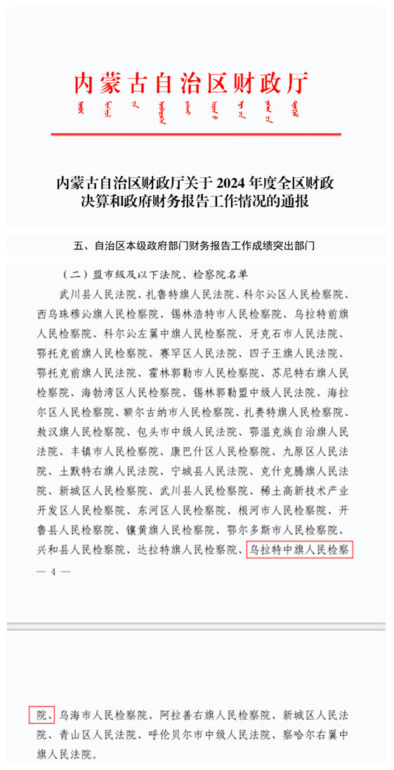 近日,内蒙古自治区财政厅印发《2024年度全区财政决算和政府财务报告工作情况通报》,对全区财政决算及政府财务报告工作先进单位予以表彰。其中,乌拉特中旗人民检察院凭借严谨规范的工作作风、精准高效的业务落实,获评“自治区本级政府部门财务报告工作成绩突出部门”,充分彰显了我院财务管理工作的扎实成效与过硬水平。